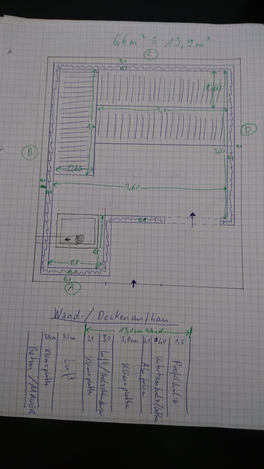Mein Plan ist nun, diese Platten direkt an die beiden Wände & Decke zu kleben. Und da drauf (also von innen sichtbar) Holz/Fliesen/Marmor (Holz, weil es schön ist) (Fliesen für die untersten 30cm als Dampfsperre) (Marmor als Hitzschutz um den Kamin). Für die Dicke der Promatplatte würde ich 5cm wählen.