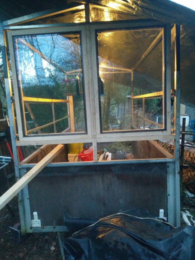 Kurz zum Aufbau: Der Anhänger war ein geschlossener, sodass ich mich an dem Metalgerüst orientieren konnte. (siehe Bild) Die Sauanbänke kommen aus einer ehemaligen Sauna eines Freundes. Die Fenster stammen noch aus unserem Haus von der letzten Rennovierung. Leider ist ein Fenster gesprungen, für uns aber kein Problem.