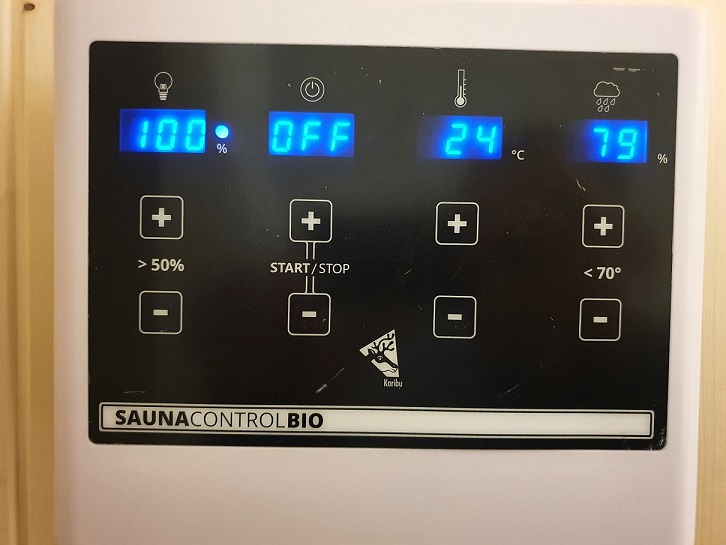 - Die Anzeige am Steuergerät ist nicht die relative Feuchte in Prozent, sondern ein willkürlicher Prozentwert bezogen auf das Saunabad.