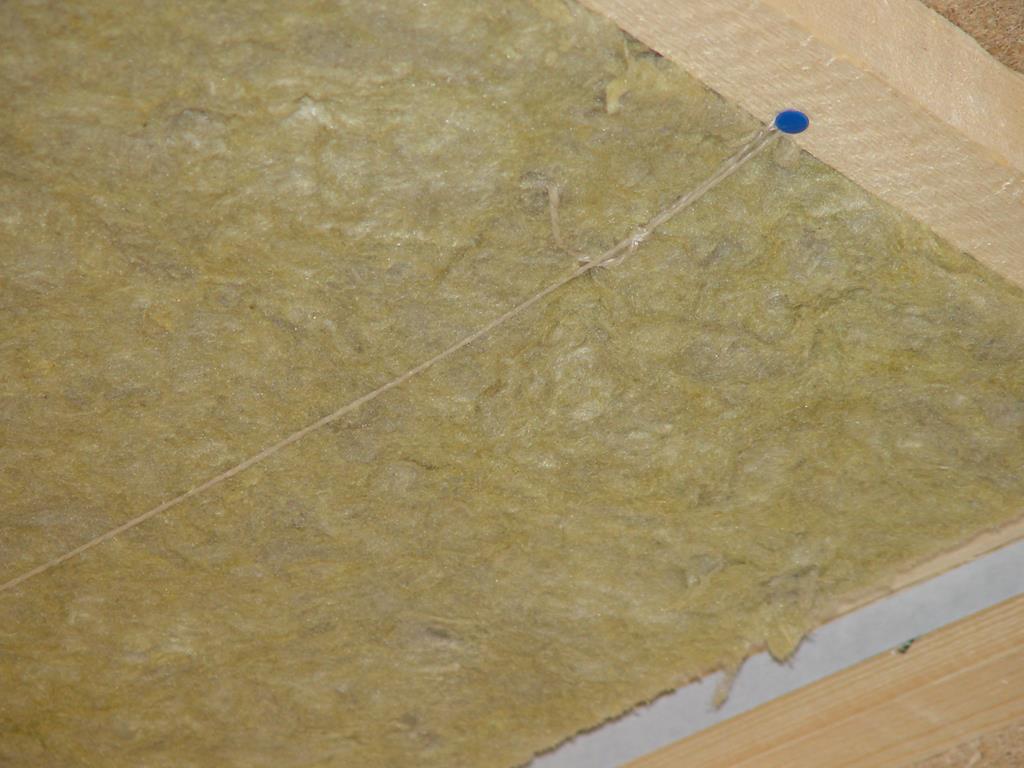 Die Isolierung besteht aus handelsüblicher Mineralwolle und ist 60 cm breit (was mir den Abstand zwischen den 4-kant Hölzer vorgegeben hat)