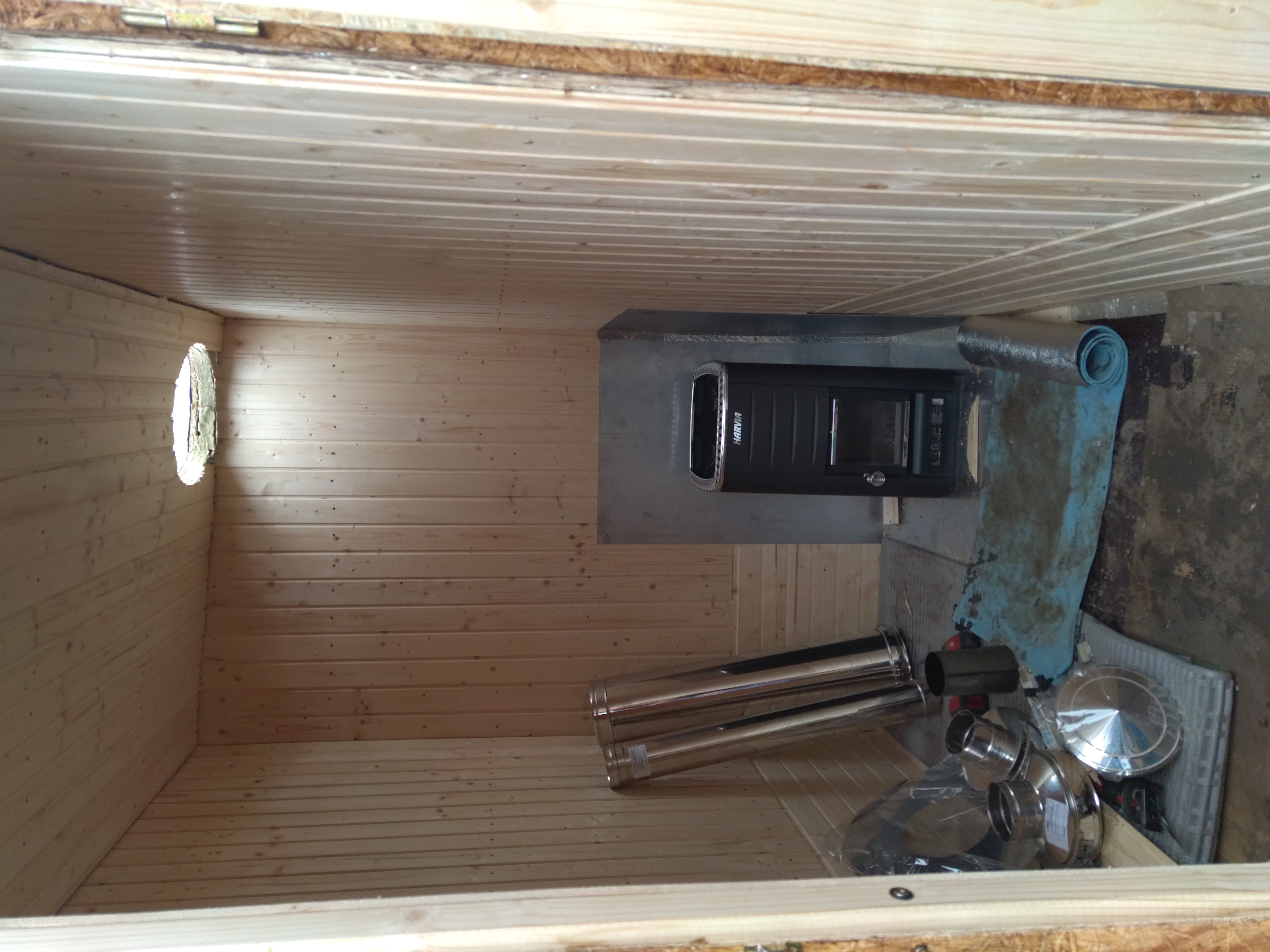 8. als nächstes kam der Ofen rein, ein Havaria M2 Holzsaunaofen, gabs im Komplett-Set mit Schornstein. Dafür muss man natürlich ein Loch ins Dach sägen. Also lieber zweimal messen. Beim Einbau muss auf die Abstände zu den Seiten- und Rückwänden achten, und natürlich darauf ob diese aus brennbaren oder nichtbrennbarem Material bestehen. Um mit geringeren Abständen arbeiten zu können, habe ich Edelstahlhitzebleche für den Boden und die Seiten verwendet. Der Lack vom Ofen und Schornstein muss vor dem Einbau an der Aussenluft eingebrannt werden. Also einmal richtig durchfeuern, bevor der Ofen eingebaut wird.