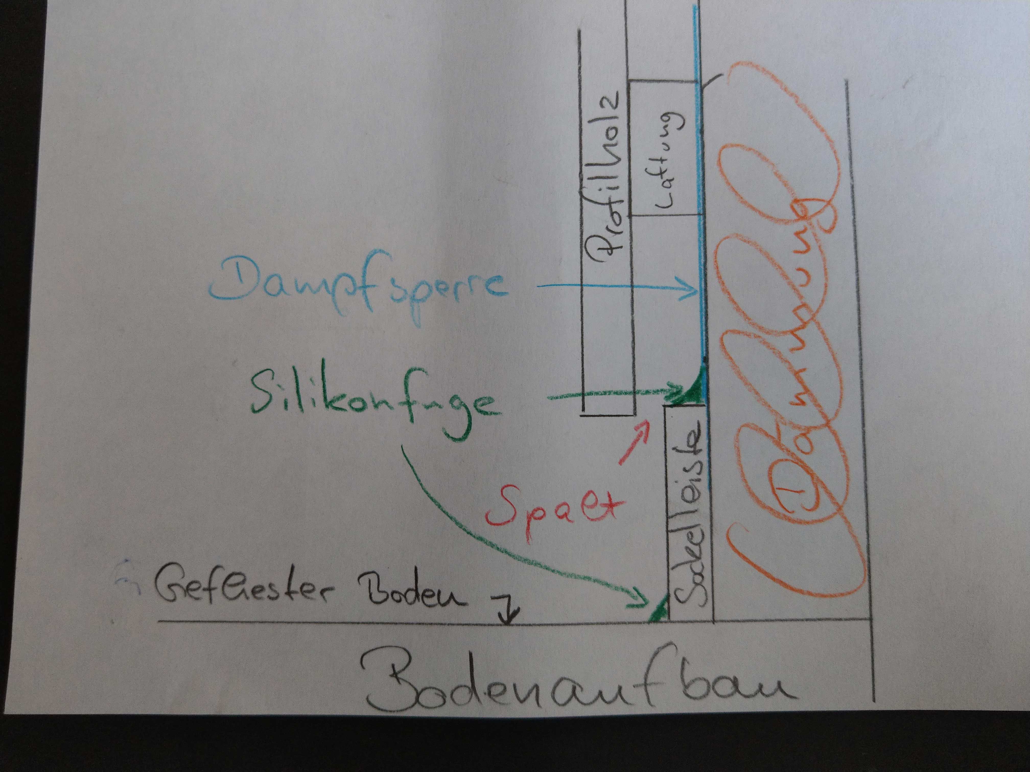 Wände sind mit Dämmung, Dampfsperre und Konterlattung versehen. Boden wird gefliest. Nun kommt eine Sockelleiste unten an die Wand, Silikonfuge in die Ecke und ich kann auch mal problemlos naß Durchwischen, da der Bodenaufbau ja so wasserdicht ausgeführt ist.