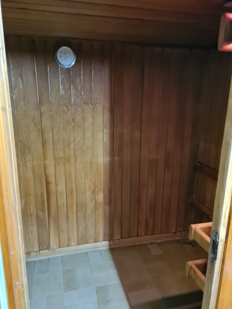 Nun werde ich die Sauna erst einmal grundlegend reinigen, habe dazu Sauna Hygiene von Mellerud gekauft und weiß, dass ich nur mit einem feuchten Lappen (nicht naß) sauber machen darf. Mit Staubsauger bin ich bereits durch, es war voller Spinnengewebe. Nicht sehr schön....